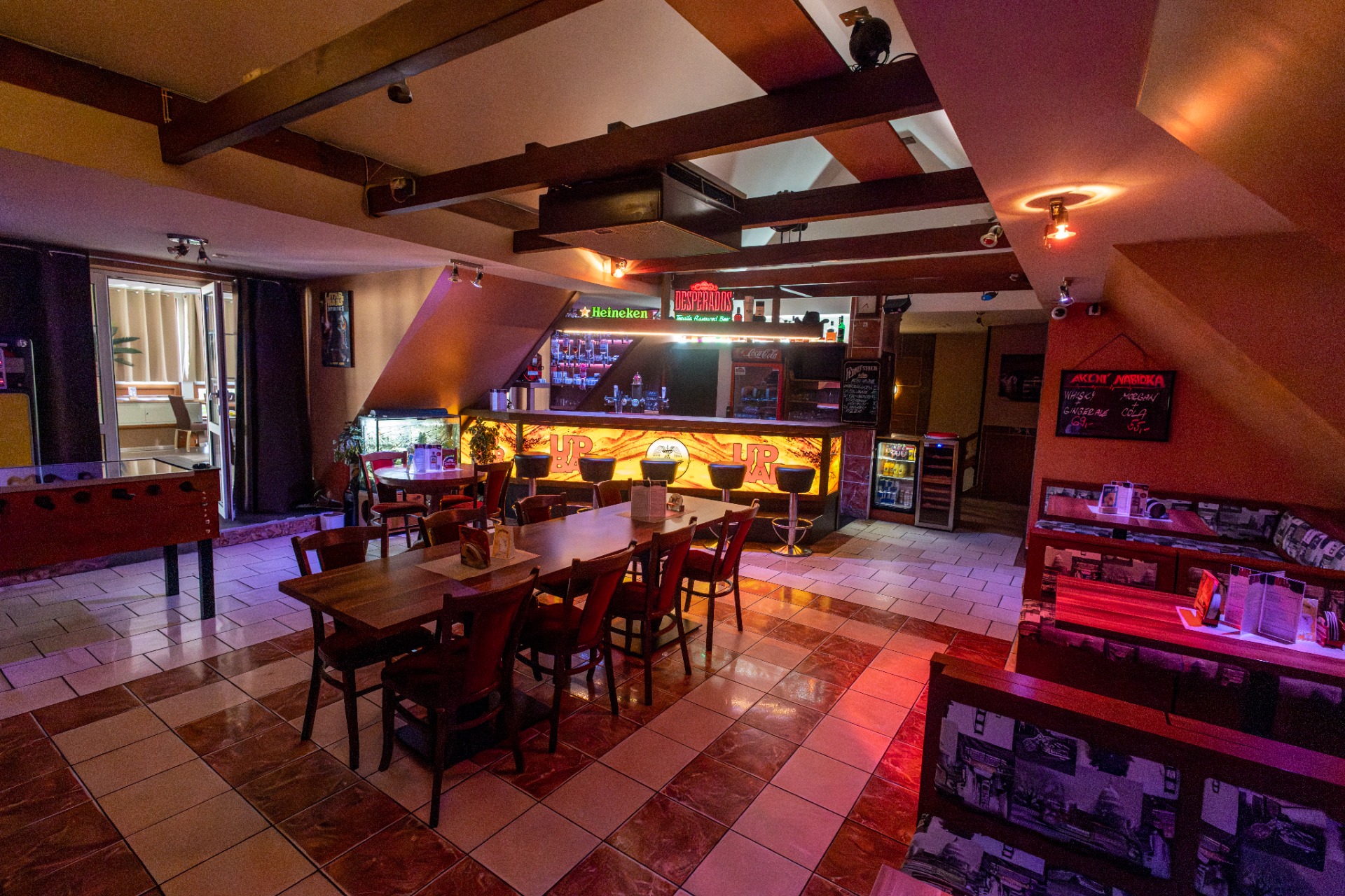 Bar nabízí vekou otevřenou terasu, šipky, stolní fotbálek nebo jukebox.